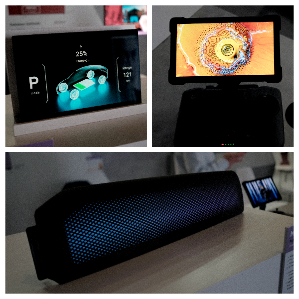 图8. 右: 无人机控台 (伙伴: 义隆电子和鸿利显示);左: 车用中控屏 (伙伴: 海微科技); 下: 氛围灯 (伙伴: 东莞精旺电子)